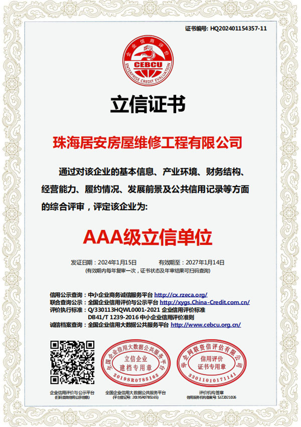 珠海居安房屋維修工程有限公司成立于2020年,是一家專注房屋維修的公司。我們擁有各類型專業(yè)人才,業(yè)務包括老舊建筑翻新改造、外墻空鼓修復、防水幕墻養(yǎng)護、外墻預置構件拆除更換、供排水管網(wǎng)改造、墻面翻新、鋼制結構建筑構建及折除,外墻清洗及裝修裝飾。 公司自成立以來,始終堅持以人為本、誠信敬業(yè)的經(jīng)營原則,與多家單位達成固定維修、養(yǎng)護清洗協(xié)儀,業(yè)務遍及廣州、東莞、中山、珠海等多個周邊城市。專業(yè)化團隊尤其在墻面及窗邊防水工程業(yè)內(nèi)知名。…… >>> 更多內(nèi)容 |